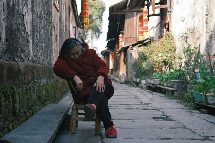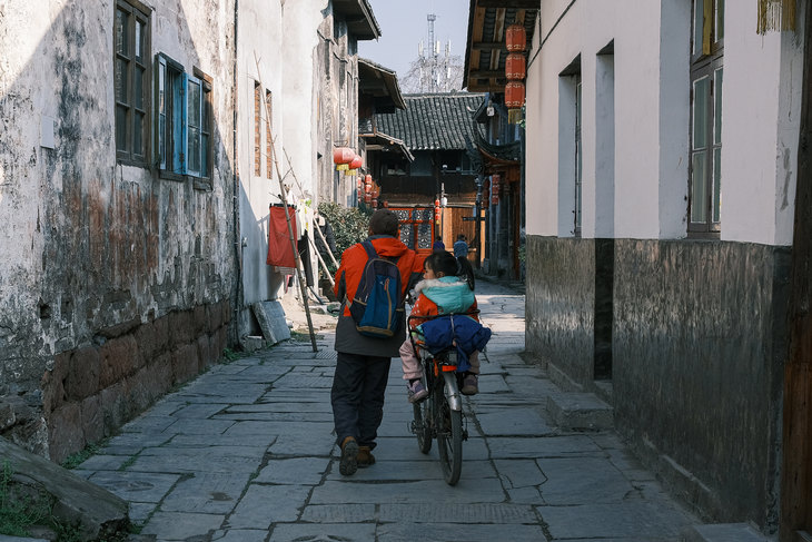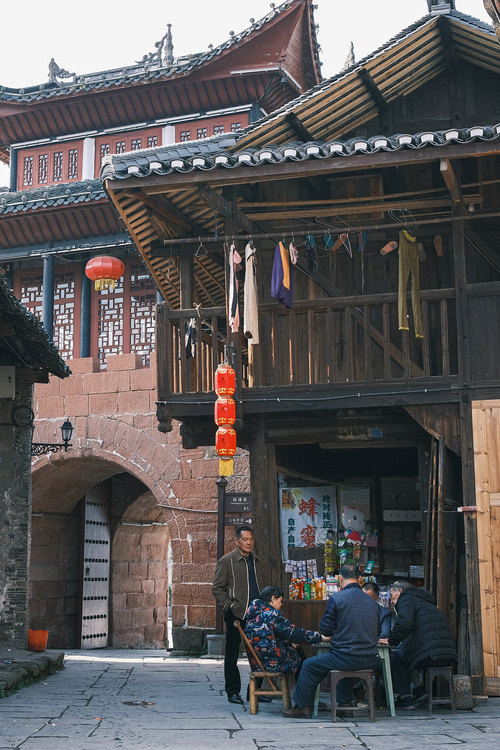 从芙蓉楼出来,没走几步路,场景就立马从精致的园林景色转换到充满生活气息的市井味道,古镇里青石街巷纵横交错,明清建筑比比皆是。年轻人不多见,但或许也是因为春节的缘故,街道上熙熙攘攘,不过这也正是小镇子最原始的味道吧。富士的胶片模拟模式这么多年一直让不少摄影爱好者甚至专业摄影师都“中毒”不已,而X100V内置的CLASSIC Neg.是我使用最频繁的胶片模拟,再结合相机内可调整的颗粒效果,拍出来的照片在色彩上更有以往胶片相机的质感。