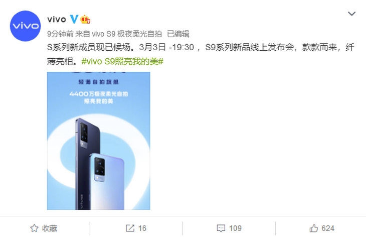 综合来看,vivo S9将是一款至少有两款配色的高颜值轻薄极夜自拍旗舰,会继续搭载4400万像素超清前置主摄和新形态的双柔光灯,且在前置自拍方面应该还有我们意料之外的黑科技,非常值得期待。感兴趣的朋友就请一起坐等3月3日19:30的新机线上发布会为我们揭秘吧。