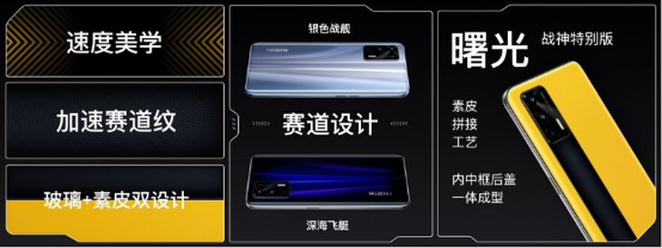 战神特别版——曙光,外观设计源自经典车型GT(GrandTourer),提取了车与赛道环境的标志性特征,重组后再设计而诞生,黑黄撞色,彰显个性。工艺上更是realme设计的再次越级,设计团队历经9个月研发,8次方案的推倒重来,开创性地采用素皮拼接工艺和内中框后盖一体成型工艺,从近百种素皮材质的优中选优,最终选择了超微粒面2.0素皮材质,纹理更细腻,握持更柔和。