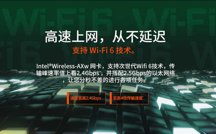 此外,这款游戏本还搭载了Wi-Fi 6无线网卡。Wi-Fi 6相比上一代无线技术,在无线传输速率方面提升了40%,最高速度甚至可以达到11Gbit/s,并且在密集用户环境中将用户的平均吞吐量提高至少4倍。
