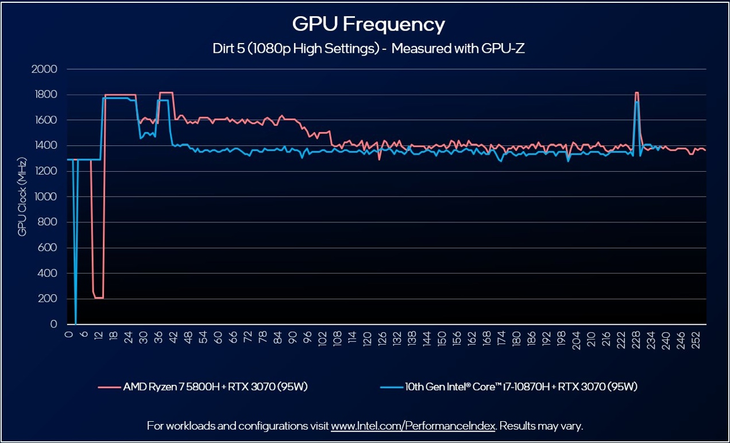 再来瞧一瞧对比测试时,这两款机器GPU负载时的频率表现。可以看到,在《尘埃5》这款游戏中,锐龙7 5800H游戏本的GPU频率是要略高于酷睿i7-10870H游戏本的。