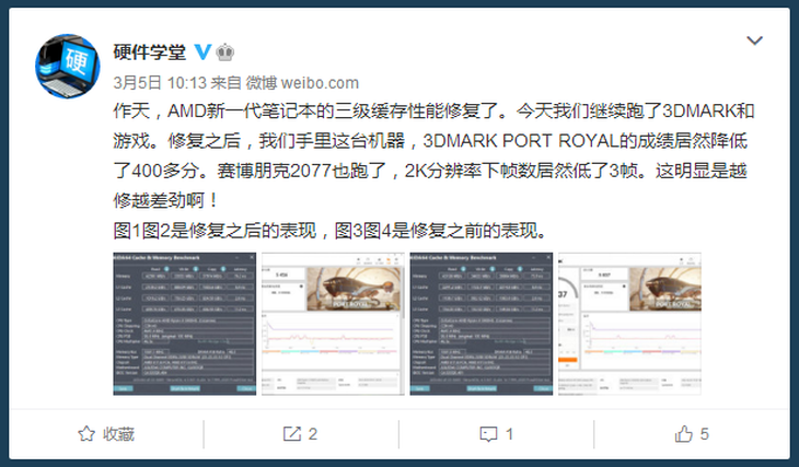 3月4号,部分笔记本厂家推送了新版BIOS,修复了AMD新一代锐龙5000系列处理器的三级缓存性能。但是根据知名数码博主“硬件学堂”的测试,在所谓的“性能修复”之后,AMD游戏本的游戏性能反而出现了明显的退步!还不如不修复的好!