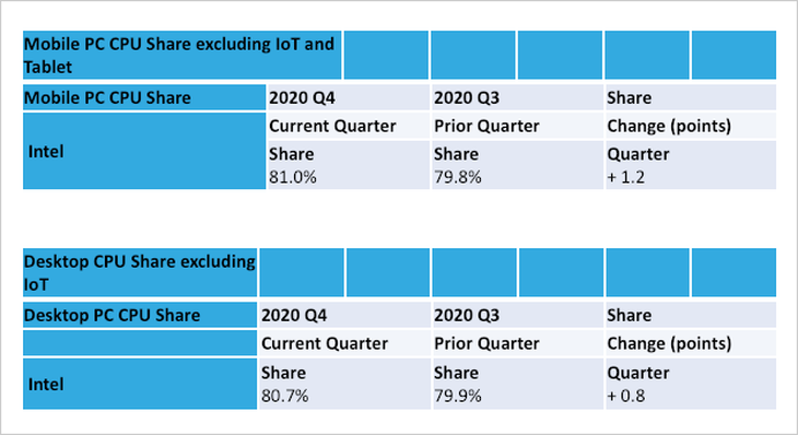 今年2月初,美国市场研究公司Mercury Research发布了2020年第四季度全球CPU市场份额的调研结果。移动PC CPU市场份额(除IoT和平板外),英特尔的市占率达到了80.7%。显而易见,在移动PC市场上,英特尔依旧是绝对的霸主。
