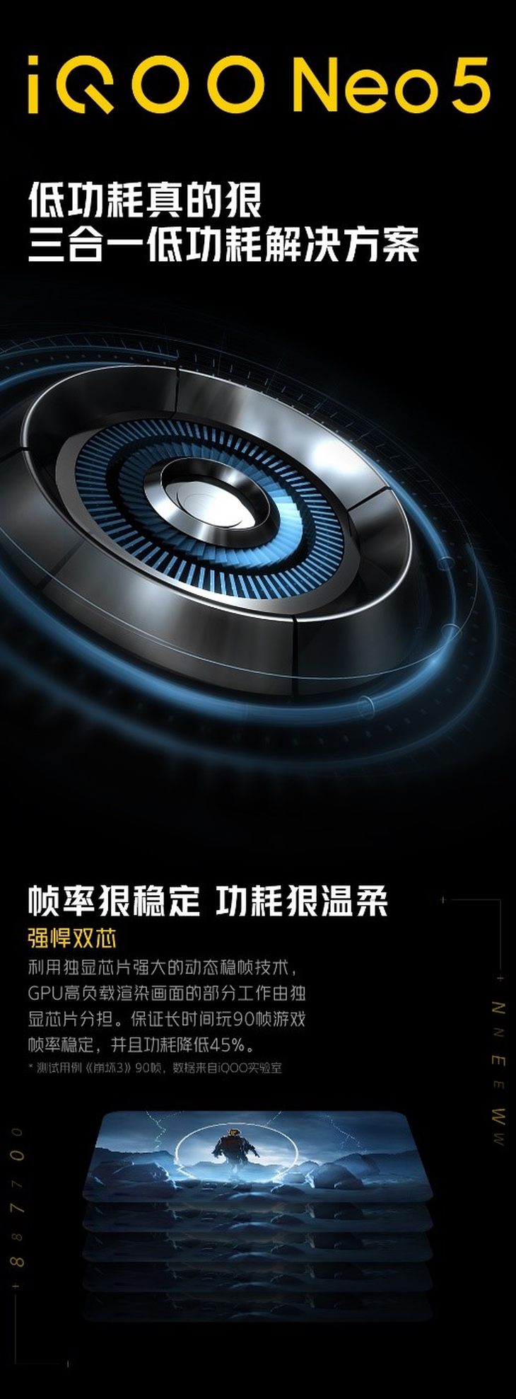 除了骁龙870芯片,iQOO Neo5还搭载了一颗独显芯片,支持强大的动态稳帧技术。原本GPU高负载渲染画面的部分工作由独立显示芯片分担完成,长时间玩90帧游戏也能保持帧率稳定,同时功耗降低45%。
