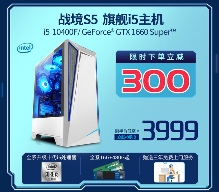 攀升战境S5十代i5 10400F/GTX1660S/16G游戏主机>>购买链接