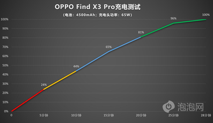 充电续航方面,OPPO Find X3 Pro配备4500mAh大电池、65W超级闪充,支持30W无线闪充,可实现10W无线反向充电。根据实际测试,使用原装的65W超级闪充从0到100%的电量只需28分钟,充电速度非常快。