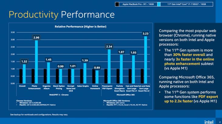 重中之重的生产力这块,英特尔进行了一系列测试,对比的机型为苹果的M1 MacBook Pro和第11代Tiger Lake i7的机器。
