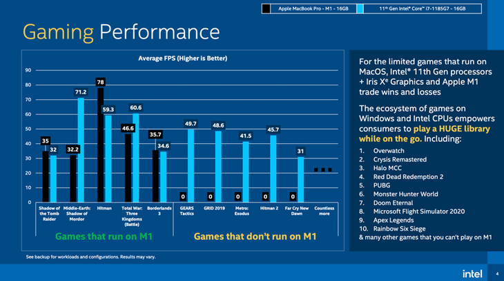 对比苹果能玩的游戏,我们可以看到第11代Tiger Lake与M1相比各有输赢。