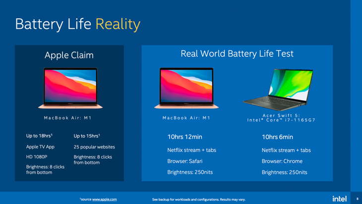 所以,英特尔把苹果的MacBook Air和宏碁Swift 5做对比测试的时候,英特尔首先把屏幕放到了250nits,这是大家日常经常会使用的亮度。第二,浏览器在Windows系统里用的是Chrome,在苹果系统里用的是Safari,因为Safari对苹果的优化会更好一些。同时我们做的事情是在Netflix上看视频流,同时打开几个不同的网站去测试。这样在比较真实的使用场景下去测试,测试下来这两台机器的电池续航基本差不多,都是在10小时多一点。