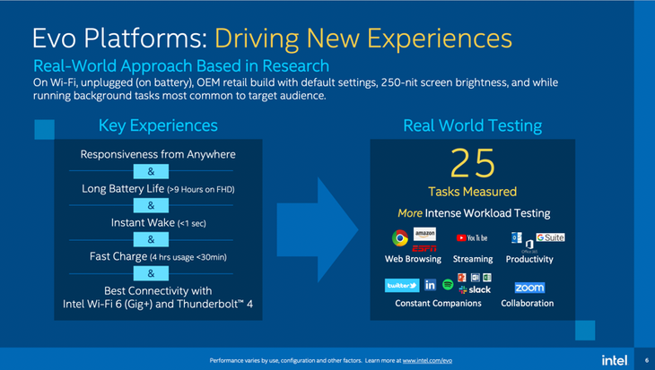 Evo平台就是想让大家在移动PC上有一个新的体验。英特尔的做法是根据现实世界中的一些很细节的调研中抓出来的,主要就是快响应、长的电池续航、快速唤醒、快充(快充情况下,30分钟充电可以使用6小时)、更好的连接(包括Wi-Fi6、雷电)。整个测试当中,英特尔是分了几个大的场景,包括上网、看视频流、工作(包括看Office等)、社交软件以及远程协作软件。在Evo测试当中,很多场景都是用户在日常当中现实当中会使用的。