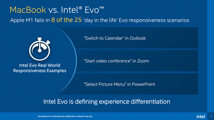 如果以英特尔Evo平台认证标准来衡量苹果M1电脑,我们会发现很多测试项苹果M1电脑都是不合格的。比如说在Office的Outlook当中,从Outlook转到日程表,与Evo的性能要求相比,苹果M1慢了大概50%。另外大家做得很多的就是视频会议,用Zoom的话,用苹果M1,根据Evo的测试标准,他会比英特尔的标准慢31%。另外比如说在PowerPoint当中选择一个图片,苹果M1也是不合格的。