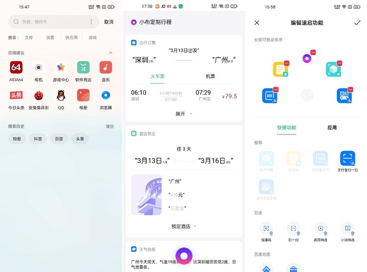 功能方面,ColorOS 11.2带来了全新的全局搜索,页面更加轻量和简洁;小布语音助手升级“一句话”处理复杂任务,比如对它说一句“我要去广州出差3天”;全新指纹速启功能,解锁后不松手即可触发,它能一键快速启动自定义的快捷功能应用,比如扫码器、乘车码等等。
