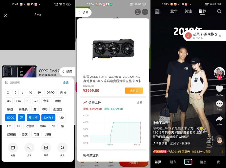 Breeno识屏同样非常实用,它能随时提取屏幕上显示的内容,哪怕是图片中原本不可复制的文字,进行复制搜索等操作;在商品页面中使用Breeno识屏,它还能帮你快速查询历史价格或进行相同商品比价,告别反复切换比价软件的繁琐操作;在刷短视频时我们常常听到自己喜欢的BGM却不知道曲名,这时候使用Breeno识屏同样可以智能识别出来,实测准确率非常高。