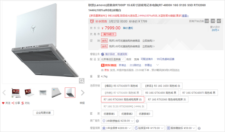 建议有一些游戏需求的消费者可以把眼光转向RTX2060游戏本,目前7千多块钱就能够买到一台很棒的机器,例如联想的这款拯救者R7000P,锐龙7搭配RTX2060的硬核组合,还有144Hz高色域显示屏,完全可以畅玩很多热门游戏了。