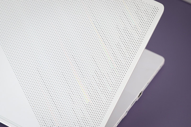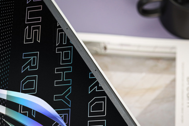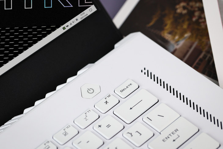 ROG幻15月耀白的白色设计看起来很靓丽。特别是,它的金属顶盖采用了创新的8279个CNC开孔,同时这些CNC开孔的内里很巧妙地融入了幻彩棱镜光效,当被较强的光线照射时,这8279个CNC开孔会呈现出引人注目的闪烁效果,令这款笔记本更加迷人。