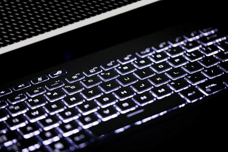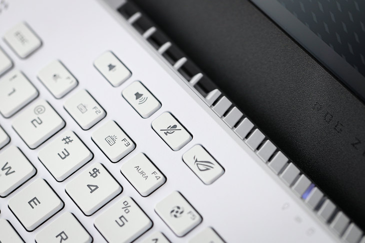键盘的左前方是一组独立的快捷键,从左到右依次为:音量增大、音量减小、麦克风静音、ROG专属按键。
