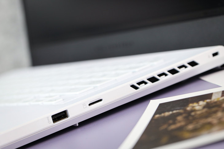 机身右侧设计有一个笔记本锁孔、一个TF卡读卡器接口、一个USB3.2接口。同时,这一侧也设计有一处散热出风口。