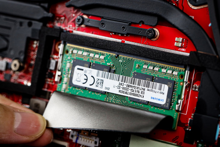 这款笔记本内部仅设计了一条DDR4内存插槽,安装的是一条8GB容量的三星内存。由于这款笔记本总计是16GB内存设计,因此可以推测,它还板载了8GB内存。