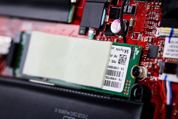 M.2固态硬盘,制造商为SK海力士。同时,这款M.2固态硬盘还加装了导热垫,令硬盘运行时产生的热量可以导到底盖上面。