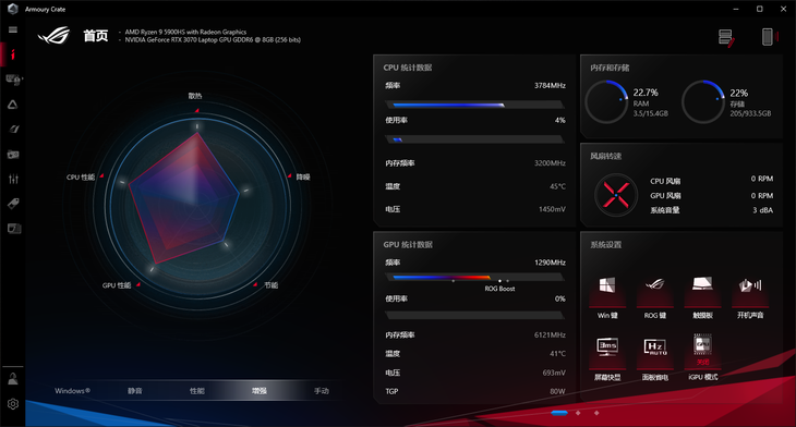 ROG幻15在系统里预装了ROG经典的奥创智控中心。利用这款软件用户们能够对电脑系统进行全方面的设置。