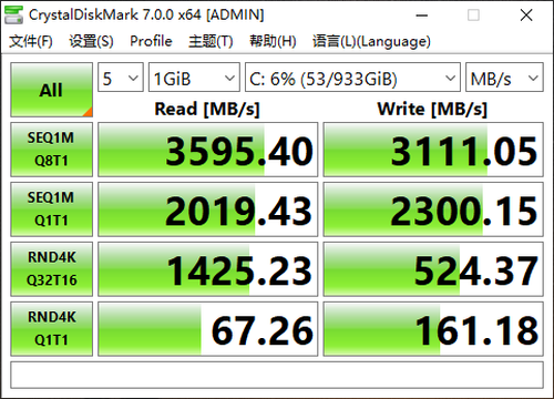 通过CrystalDiskMark这款测试软件的成绩来看,这块SSD非常棒,顺序读取速度超过3500MB/s,顺序写入速度超过3100MB/s,在PCIe3.0 x4固态硬盘当中属于高端货了。