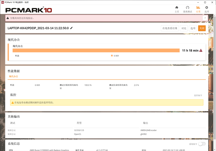 利用PCMARK 10,笔者继续对这款笔记本进行了续航能力实测。