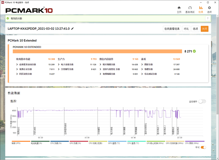 在性能模式下,开启独显,这款笔记本在PCMARK 10现代办公续航项目测试中,实现了9小时45分钟的成绩。
