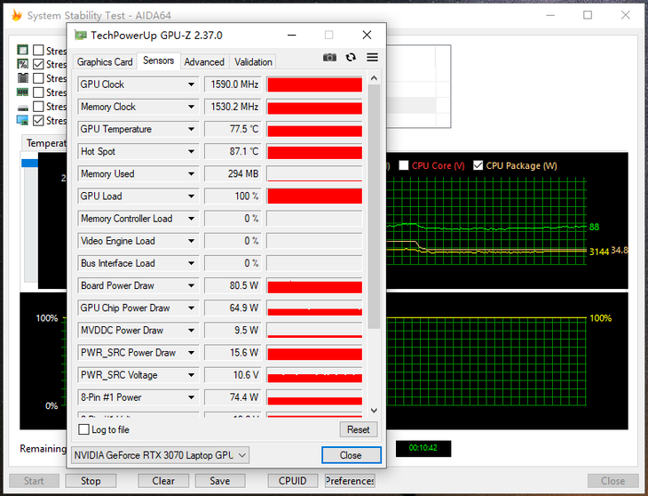 笔者利用AIDA64自带的压力测试,继续对这款笔记本的CPU和GPU进行了双烤机测试。