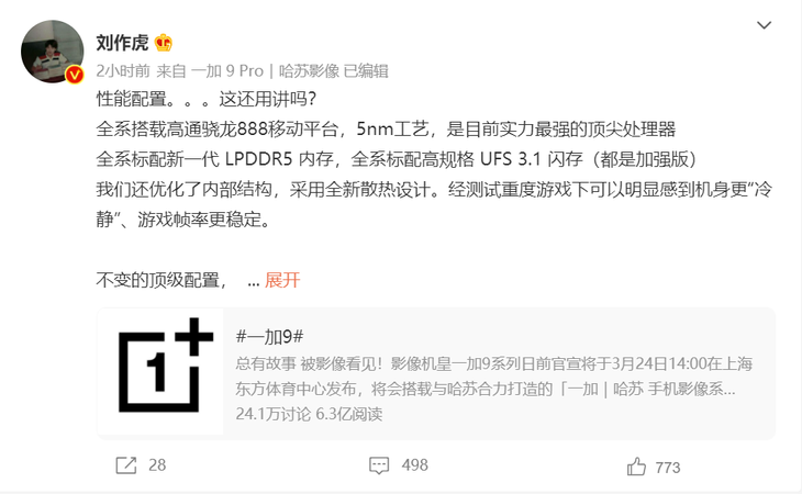 3月18日,一加科技 CEO刘作虎在微博上公布了一加9系列的性能配置信息,表示将会全系标配骁龙888平台。