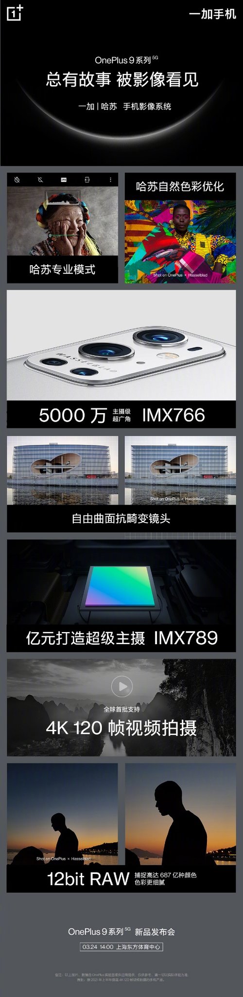 其它方面,根据此前公布的信息,一加 9 系列全系标配采用自由曲面镜头的 IMX766 超广角。其中,一加9 Pro影像部分将会有哈苏加持,所采用的IMX789主摄支持捕捉高达 687 亿种颜色的12bit RAW格式影像、4K 120帧视频拍摄。