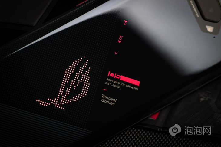 腾讯ROG游戏手机5的外观辨识度非常高,在机身背部可以看到一个大大的ROG LOGO,这个LOGO实际上也是大尺寸的LOGO灯,基于炫彩点阵设计,可以呈现出混色渐变的效果,当灯光亮起,腾讯ROG游戏手机5展现出了它电竞的一面。