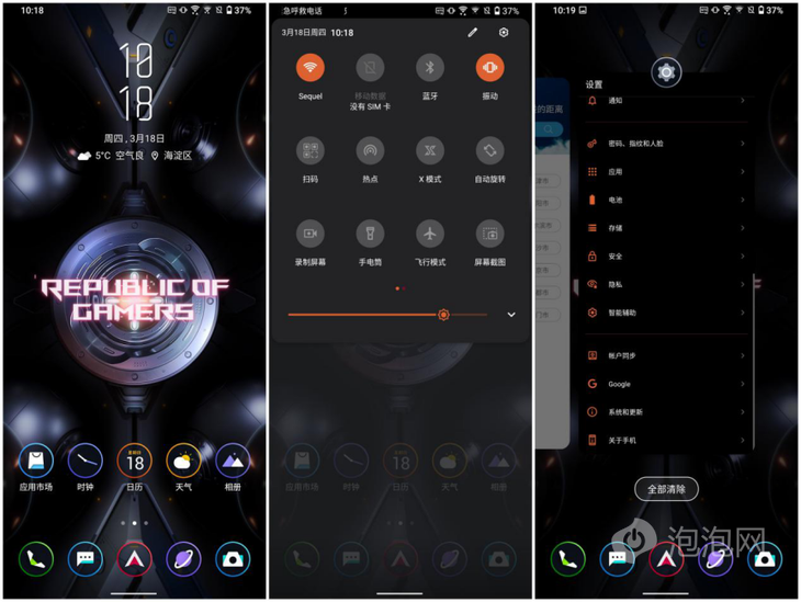 腾讯ROG 游戏手机5可以更换电竞风格的主题,包括包括动画锁屏、动态壁纸、图标、声音、来电动画、息屏时钟等部分的样式都可以自定义,从多样性和易用性上为玩家带来了体验的提升。