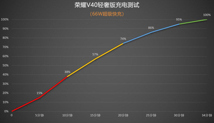 在实际的充电测试中,我们能看到荣耀V40轻奢版确实能做到在差不多半个钟头的时间中完成一个充电周期,尤其是前期十几分钟就能将手机从0电量充至一半。在实际的生活场景中,你或许晚上忘记了充电,但是从起床起开始充电,基本上就只是洗漱的时间,就能获得足够的电量,出门再也不用担心手机的续航问题了。
