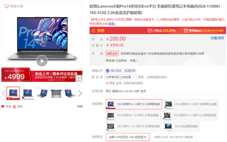 联想小新Pro 14 2021酷睿标压版已正式开启预售。配置方面搭载有英特尔第11代酷睿H35处理器,配备16GB LPDPR4X-4266内存和512GB PCIe固态硬盘,2.2K高色域屏,预售价4999元,3月31号支付尾款后即发货。
