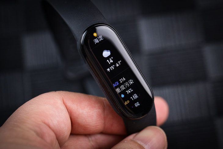 得益于全面屏设计, 小米手环6的屏幕比同类型产品的屏幕能够显示更多信息,甚至可媲美不少智能手表产品,我们在日常使用的过程中显示时间、天气、电量、运动数据等信息内容。