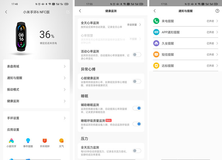 健康监测一直是小米手环的核心功能,小米手环6内置PPG生物传感器,其中NFC版额外包含红外离腕检测功能,测量更精准;同时新增血氧监测功能与心脏健康监测,以及呼吸睡眠质量监测功能,支持24小时心率异常监测,多维度健康监测升级。
