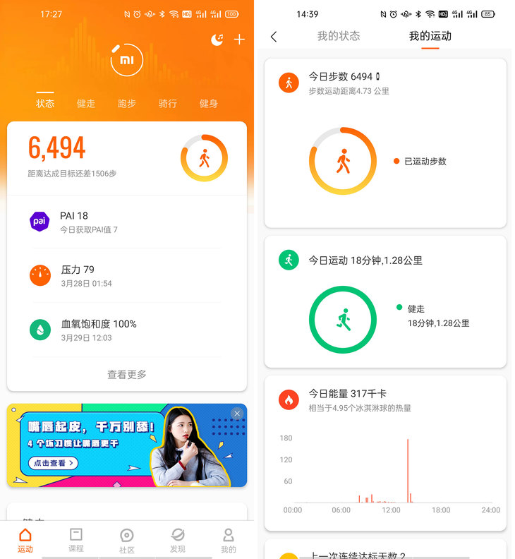 与“小米运动”APP配对连接后可直接在手机上同步手环功能