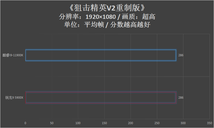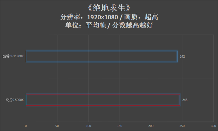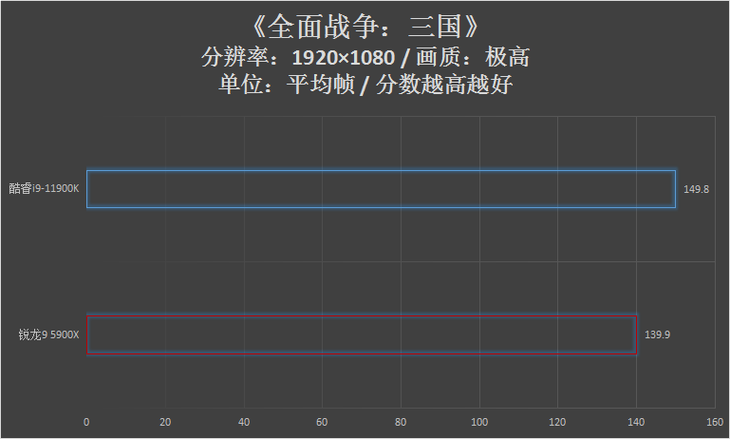 为了对比酷睿i9-11900K的性能,笔者还加入了AMD锐龙9 5900X这款处理器的成绩。锐龙9 5900X采用12核心24线程设计,是AMD现役的高性能游戏处理器之一。