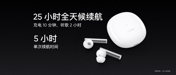 真我Buds Air2配备10mm大动圈单元、旗舰级类钻石振膜。真我Buds Air2可实现88ms超低延时,充电10分钟听歌2小时,搭配充电仓最长可达25小时续航,支持开盖闪连。