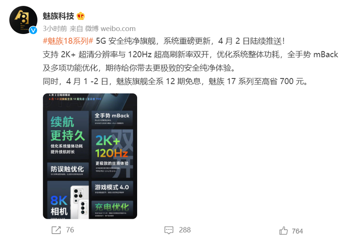 3月31日,魅族官方宣布,魅族18系列系统重磅更新将会在4 月 2 日陆续推送。
