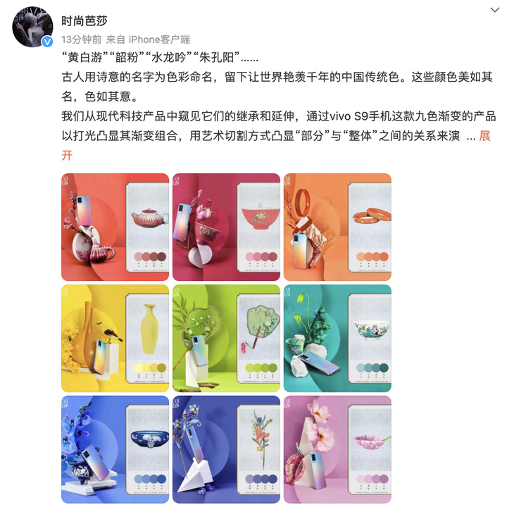 近日,vivo与时尚芭莎跨界合作,以“中国传统色”为色彩表达基础进行艺术创拍。此次创拍的主角为vivo S9印象拾光配色,这款配色可实现十分炫酷的九色渐变效果。