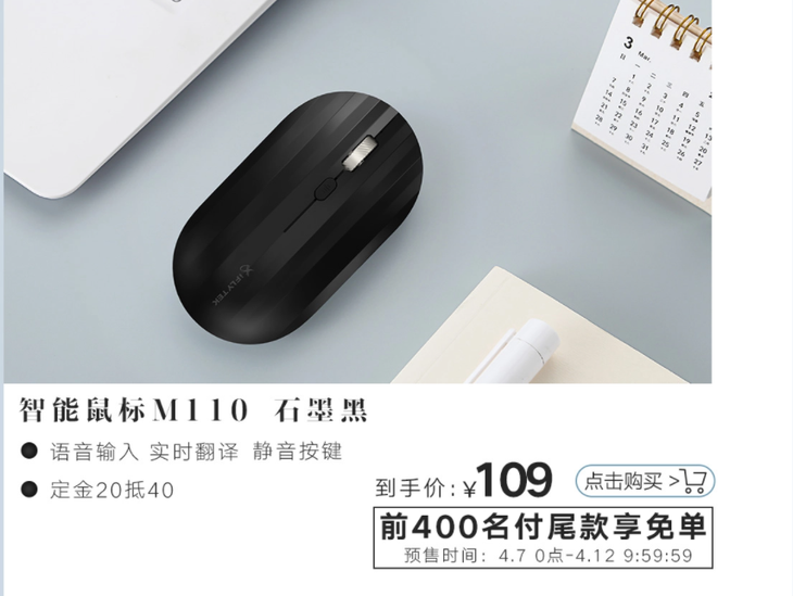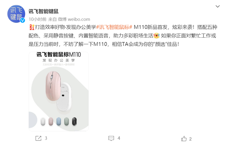 今天,科大讯飞宣布讯飞智能鼠标M110新品首发,支持语音输入,首发到手价为109元。