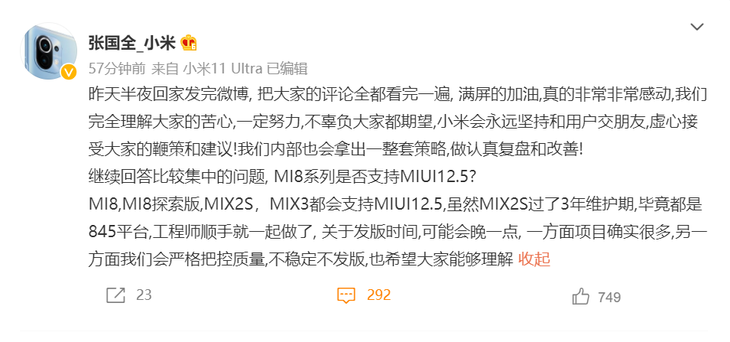 张国全表示,小米8、小米8探索版、MIX2S、MIX3都会支持MIUI12.5,虽然MIX2S过了3年维护期,毕竟都是845平台,工程师顺手就一起做了,发版时间可能会晚一点。