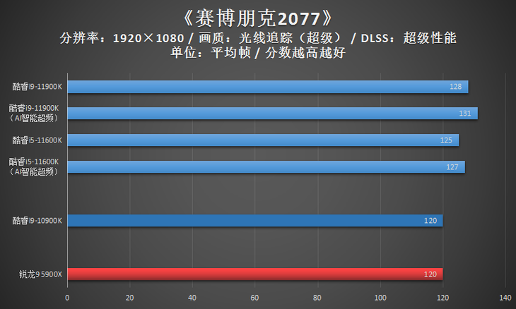 通过笔者的实测来看,在开启了AI智能超频之后,酷睿i9-11900K平台在运行《赛博朋克2077》时有了3帧的性能提升,酷睿i5-11600K平台在运行《赛博朋克2077》时有了2帧的性能提升。