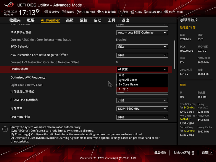 在华硕ROG-STRIX-Z590-A-GAMING-WIFI吹雪主板的BIOS中找到“CPU核心倍频”选项,然后选择“AI优化”设置,AI智能超频在系统重启后即可自动开启。