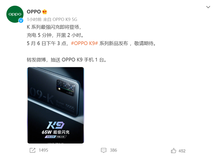 OPPO K9官宣:5月6日发布 搭载65W超级闪充