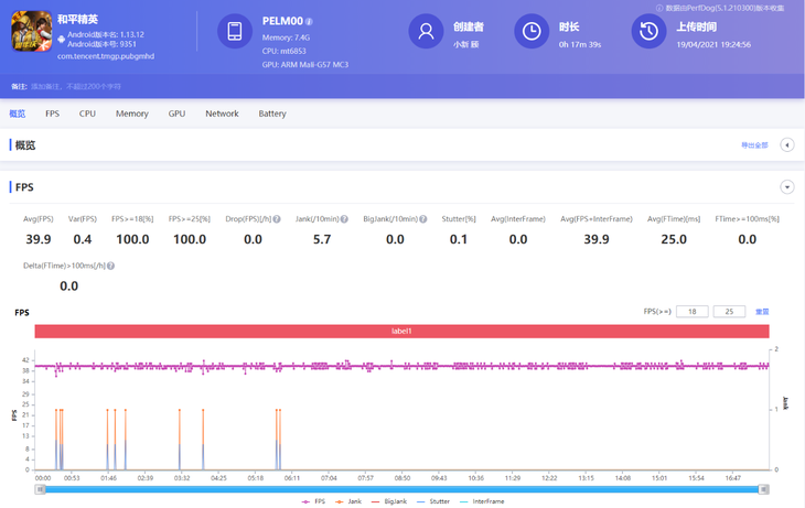 在《和平精英》游戏测试中,采用均衡画质+超高帧数画质设置,软件记录的平均帧数为39.9帧。虽然帧数波动比《王者荣耀》稍大,但整体帧数仍旧非常稳定,拖动视角、开镜开枪等操作响应都很迅速。