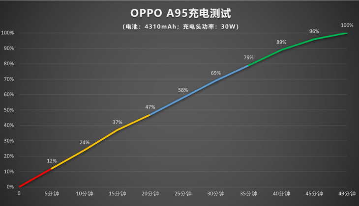 在手机电量耗尽后进行充电测试,15分钟就能达到37%的电量,30分钟达到69%的电量,达到100%电量用时49分钟。OPPO A95的电池容量并不小,能有这样的充电表现也很不错了。