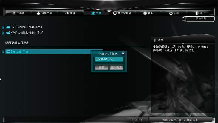 然后在“工具”界面下找到“Instant Flash”,按回车键,系统便会自动扫描U盘里面的主板BIOS文件。