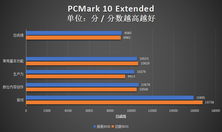 PCMark 10的总成绩,新版BIOS的性能表现是略有提升的。